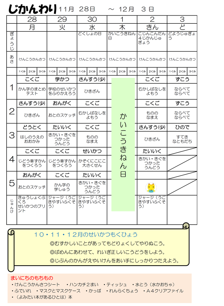 4月(2日目) 下校午後12時(給食なし) 4月(3日目~) 下校午後13時半(4時間授業・給食あり) 5月GW明け~ 時間割通り(5時間授業・給食あり) そして、4月の下校